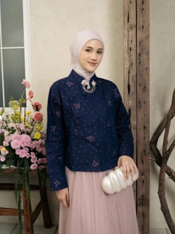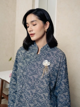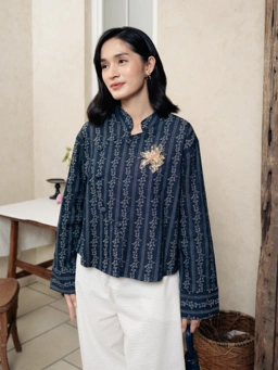 Outer motif bergaya oriental dengan kerah mandarin, potongan depan asimetris, lengan panjang, dan siluet longgar yang terlihat rapi, memberi kesan elegan dan stylist.
